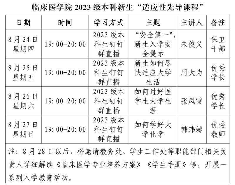 “适应性先导课程”以导师授课和学长分享为主,涵盖入学安全提示、大学课程介绍、学习经验分享、学业规划与自我提升等方面。在为期四天的课程中,学校保卫处副处长朱俊义向大家讲授了交通安全、防盗防骗、人身安全、消防安全等安全知识;小黄书 2021级临床9班班长周大为向同学们介绍了学校学习和生活的方方面面,如基本情况、入学准备、入学报到、宿舍、军训、学习、饮食等内容;考取上海交通大学研究生的2023届优秀毕业生张凤雪向同学们分享了学习、考研、时间管理以及学业生涯规划等珍贵经验;药学院副教授韩玮娜从“为什么学?学什么?怎么学?”出发,向同学们讲解了学好大学化学的方法和经验。