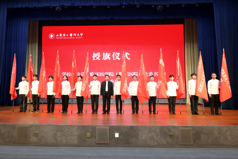 王承高为12支见习队授旗。旗帜飘扬,承载着医学的使命与责任,也寄托着学院对同学们的信任与期望,同学们将以旗帜为引领,在临床见习中锤炼医术,在生命课堂中淬炼仁心。