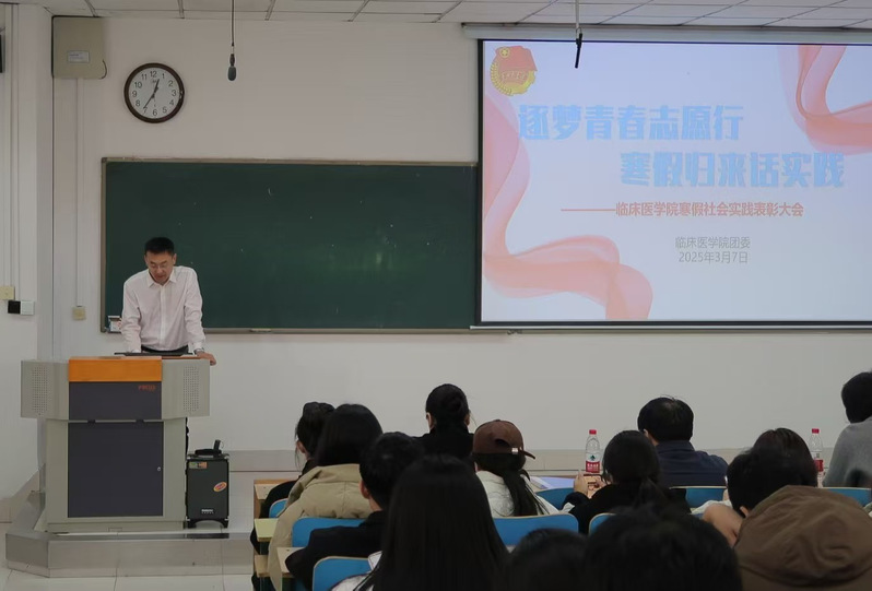 刘刚全面总结了寒假期间同学们在社会实践中的优异表现,向获得表彰的同学表示祝贺,并提出三点期望,一是筑牢信仰之基,主动对接“健康中国”战略,将个人职业理想融入国家医疗卫生事业发展大局。二是秉持知行合一,在临床实践中淬炼专业技能,努力成为具有“医生气质”的优秀医学人才。三是践行医学生誓言,主动参与实践,躬身践行“大医精诚”精神,彰显新时代医学生的使命担当。大会为先进个人颁发荣誉证书,重点团队负责人和先进个人代表围绕社会实践活动经历、活动成果、活动感悟进行经验分享。