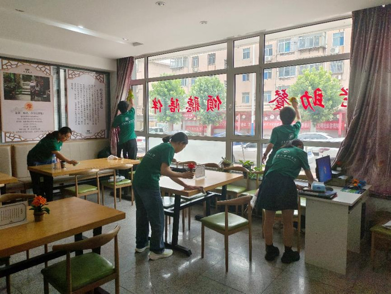7月13日,队员们来到虞中社区幸福长者食堂,在负责人孙红专老师的指导下,对食堂就餐区、操作间等场所进行了全面的环境清洁和深度消毒,重点优化了餐桌椅摆放等细节,有效提升了供餐环境的整洁度与舒适感。同时,队员们还同步开展了垃圾分类知识宣传,通过张贴海报、现场讲解示范等方式,引导居民养成良好卫生习惯,助力提升社区整体卫生水平。