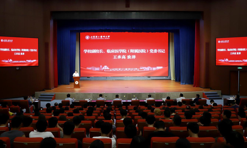 王承高对2025级新生的到来表示热烈欢迎。他深情介绍了学校办学层次的跨越式发展及学院人才培养质量的丰硕成果,祝贺新生成为学校高质量发展新征程的见证者和参与者。借此,他向新生提出三点期望:一要坚定理想信念,做志存高远的追梦人;二要练就过硬本领,做勤学笃行的实干家;三要锤炼高尚品格,做仁心仁术的践行者。他勉励新生以2025年“最美医生”、齐鲁时代楷模、优秀校友张军桥为榜样,做“沉得下、用得上、干得好”的人民健康守护者。