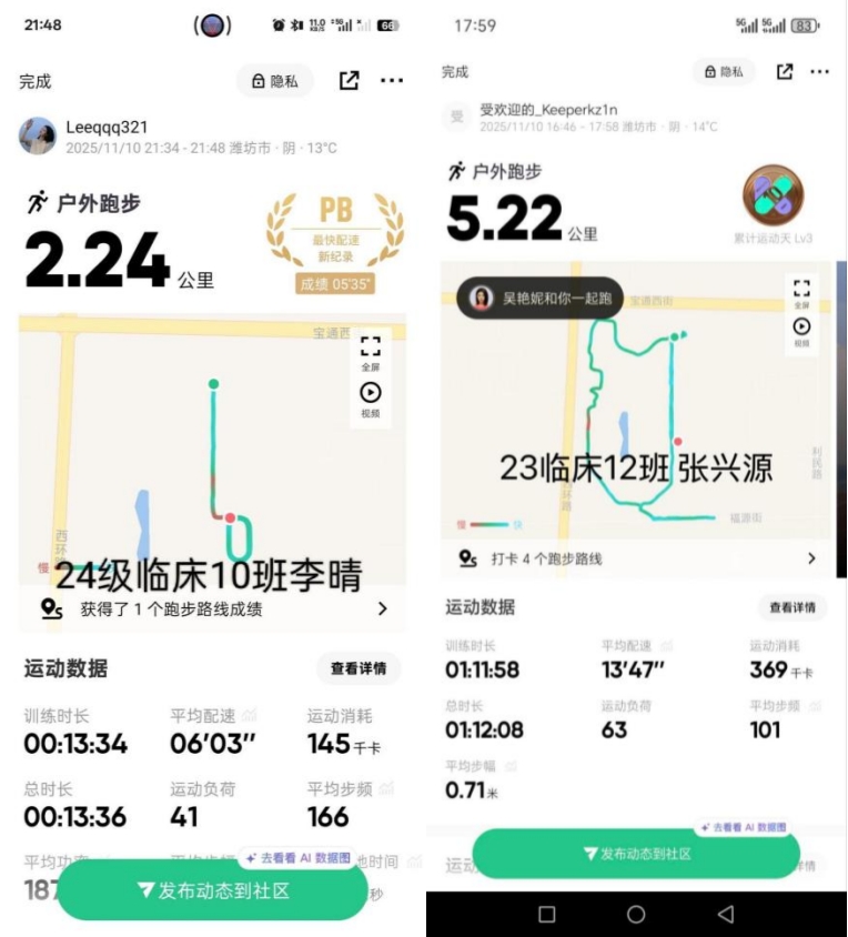 本次活动鼓励同学们使用运动软件记录跑步里程与轨迹,并上传至指定平台完成打卡。同学们紧张的学习之余,积极利用清晨、傍晚等课余时间,在操场、校园绿道等场所坚持跑步锻炼。活动期间,累计收到有效跑步里程数千公里,充分展现临床学子积极参与体育锻炼的热情和持之以恒的奋斗精神,彰显新时代医学生朝气蓬勃、昂扬向上的精神风貌。