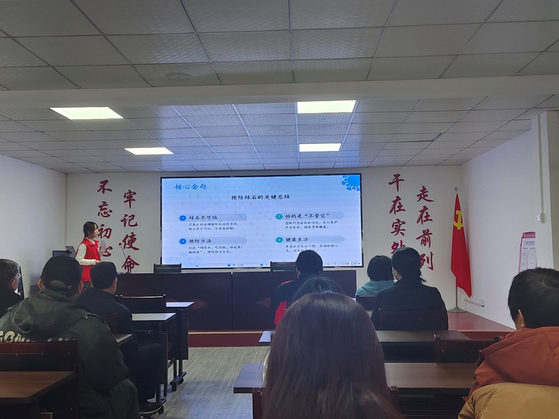宣讲内容聚焦糖尿病、消化系统溃疡及泌尿系统结石等社区高发疾病,展开系统化、贴近生活的健康知识普及。在糖尿病防治板块,志愿者们结合生活实例,生动讲解疾病成因、日常自我管理及并发症预防要点等内容,帮助居民树立科学防控观念。针对消化系统溃疡,宣讲团队深入剖析常见诱因与典型症状,并提供切实可行的饮食与生活调理建议,强调“早发现、早干预”的重要性。在泌尿系统结石环节,志愿者通过直观的图表展示与真实案例解析,清晰阐述发病机制、预防手段及规范就诊路径,有效提升居民的健康自主管理意识与能力。
